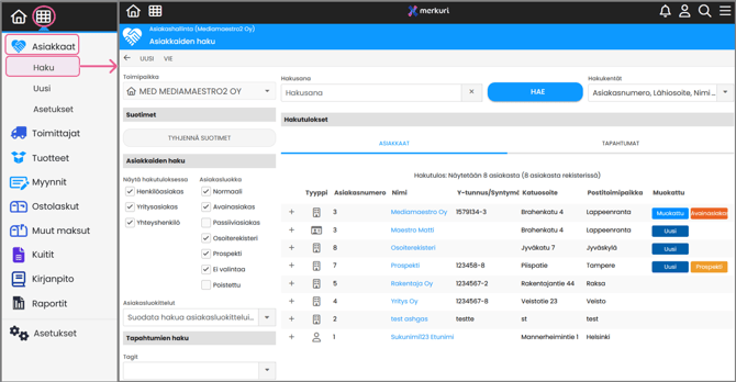 Valitse Asiakkaat → Haku