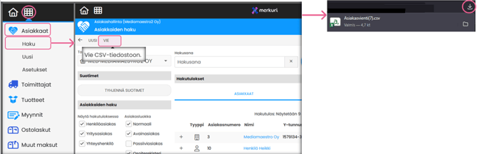 Etsi latauksista tiedosto Asiakasvienti.csv.
