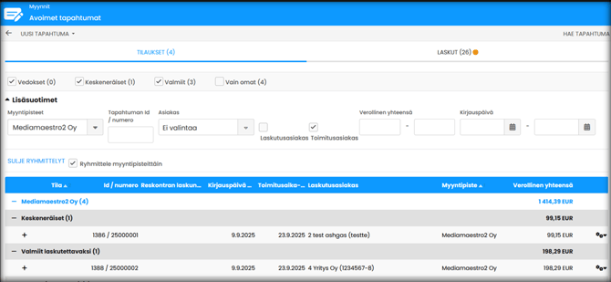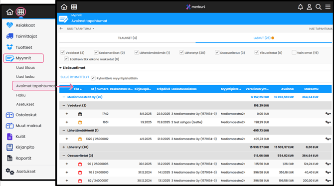 Avoimet tapahtumat -lista esittää yhdellä kertaa kaikki keskeneräiset ja käsittelemättömät myyntitapahtumat sekä edellisen kolmen kuukauden aikana maksetut tapahtumat.