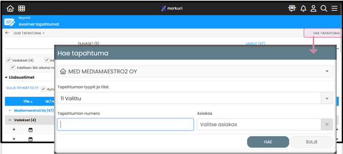 - Valitse, minkä asiakkaan tapahtumia halutaan hakea