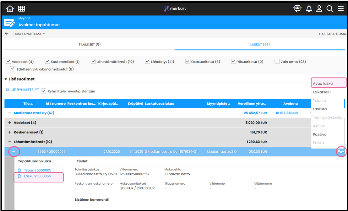 - Painamalla Avaa lasku / Avaa tilaus -painiketta rivin oikeassa reunasta avattavasta valikosta