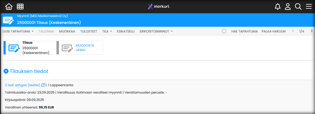 Avatun myyntitapahtuman yläpalkin toimintojen aktiivisuus riippuvat tyypistä (tilaus tai lasku) ja tilasta (esim. keskeneräinen, valmis, maksettu)