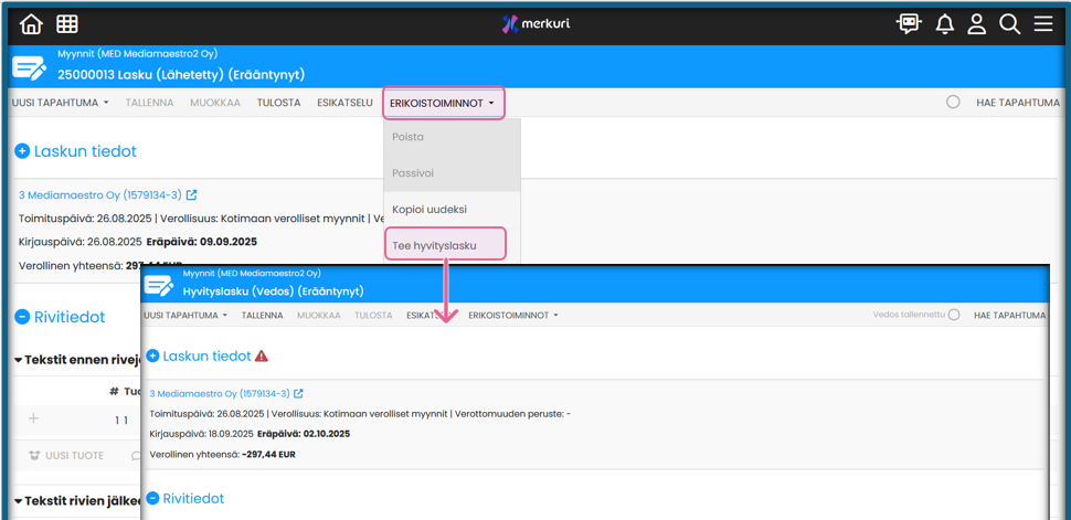 2. Valitse yläreunan valikosta Erikoistoiminnot → Tee hyvityslasku.