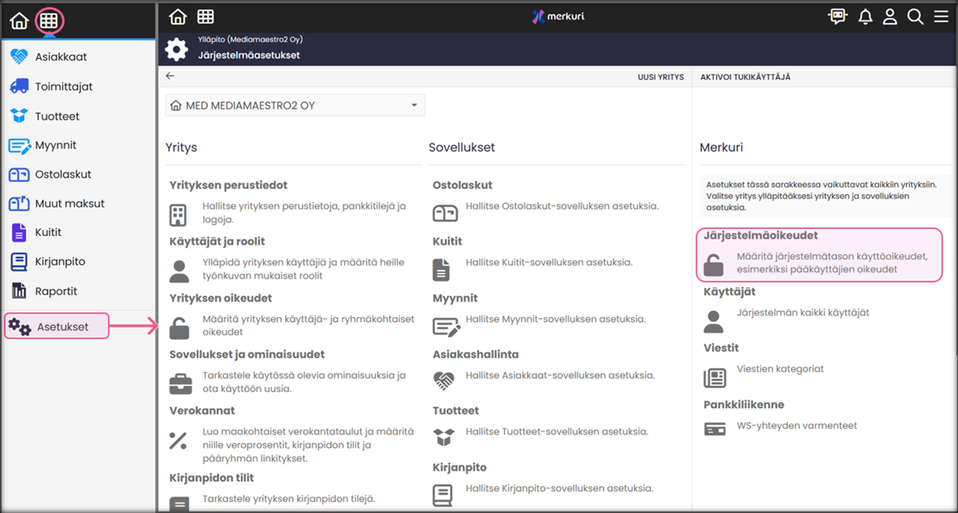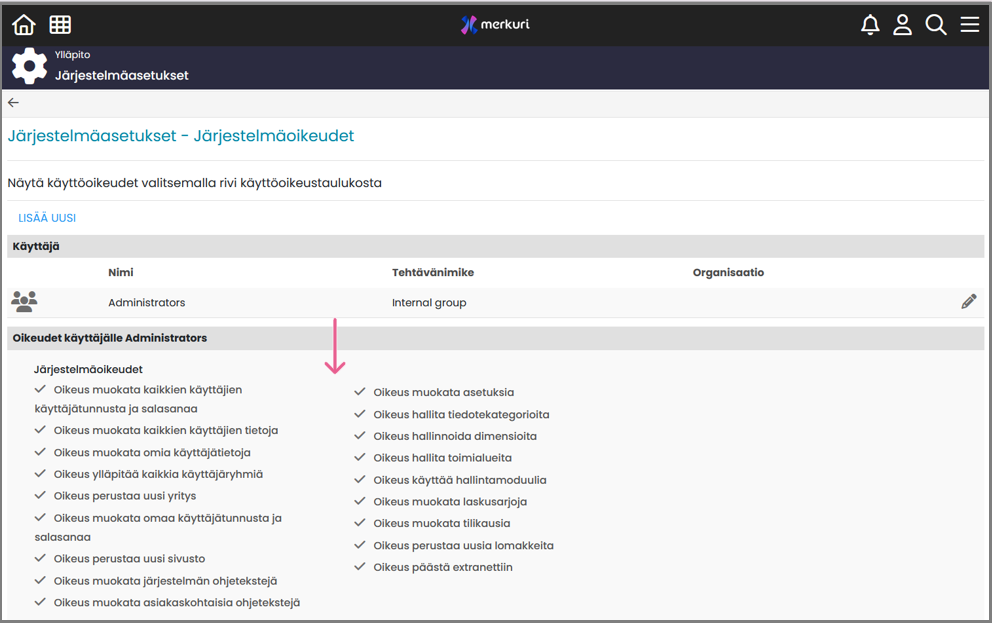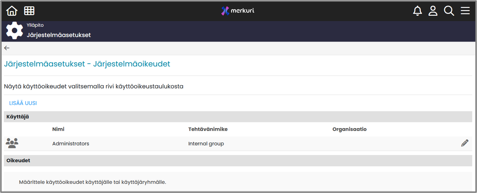 Järjestelmäoikeudet ‑näkymässä näet valmiiksi määritellyt oikeusroolit ja niiden sisältämät oikeudet. Voit tarkastella ja muokata roolien oikeuksia seuraavasti.