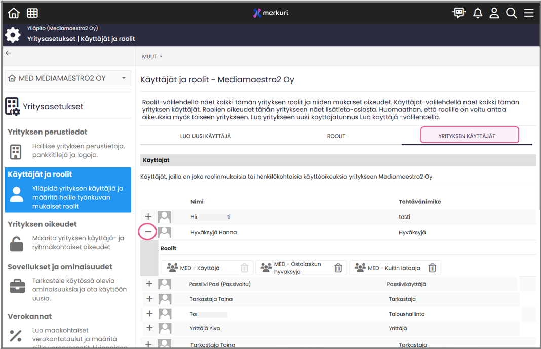 Roolit-näkymä näyttää kaikki yrityksen roolit sekä niihin liitetyt käyttäjät.