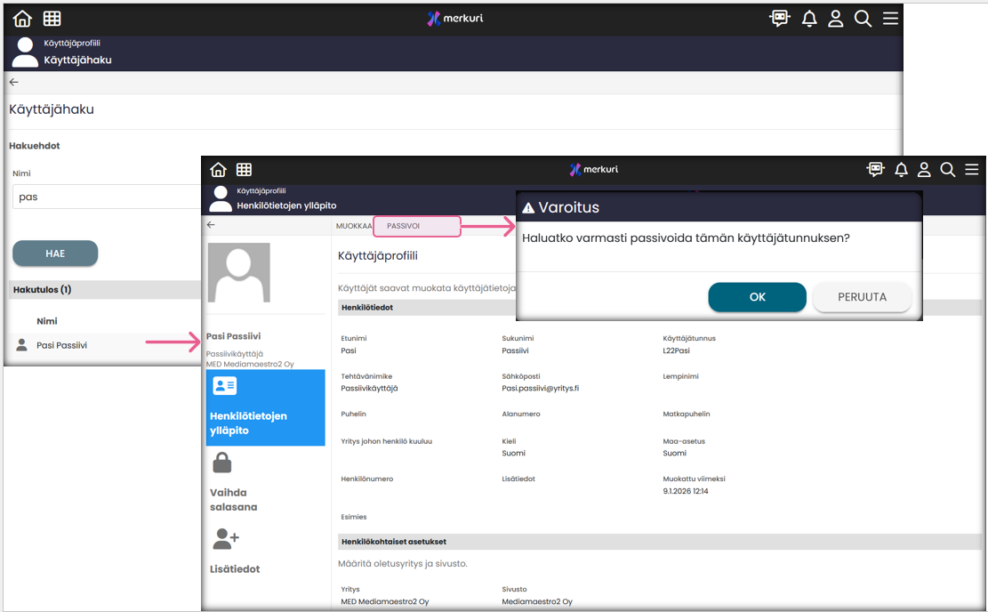→Tulee ilmoitus "Haluatko varmasti passivoida tämän käyttäjätunnuksen?". Klikkaa OK
