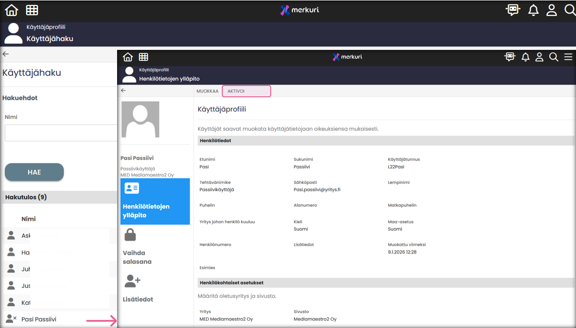 - Avaa passivoitu käyttäjätunnus ja klikkaa AKTIVOI