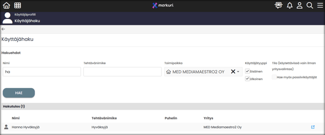 - Klikkaa käyttäjän riviä → käyttäjätunnus avautuu samaan selaimen välilehteen hakulistauksen kanssa.