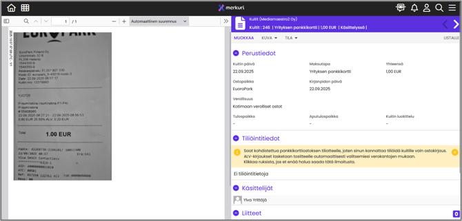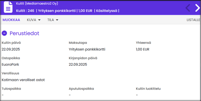 | 1. Perustietojen tarkastus | Tarkasta ja täydennä kuitin perustiedot. |