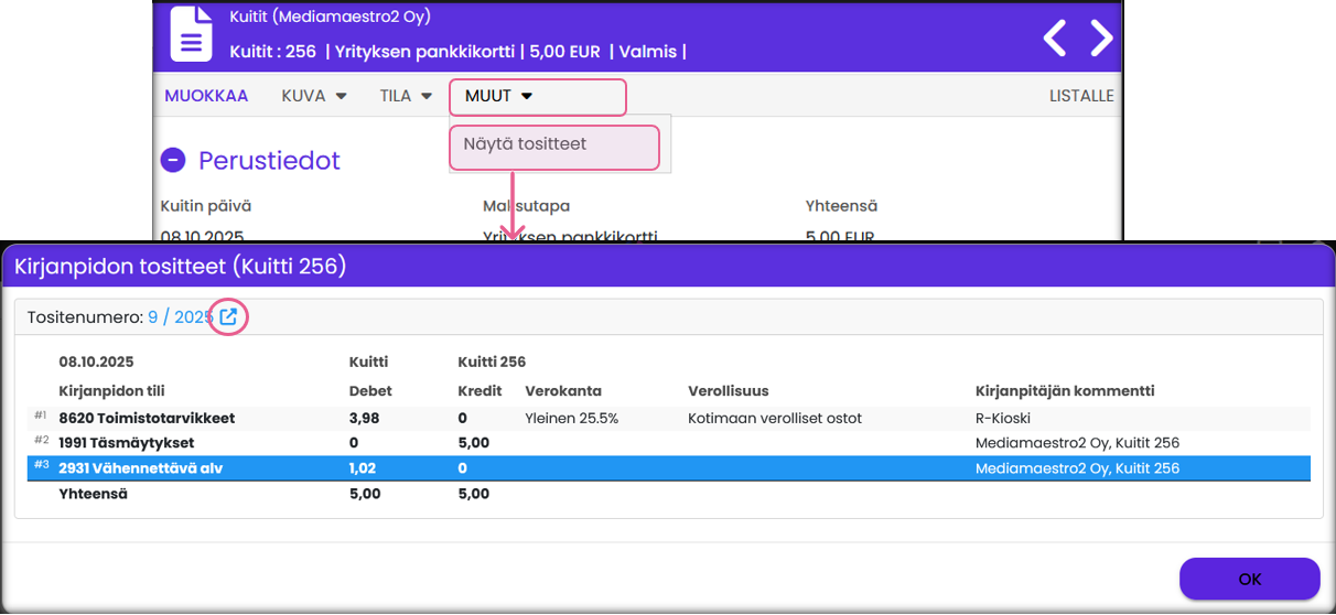 → Kuittiin liittyvä tosite tulee näkyviin.