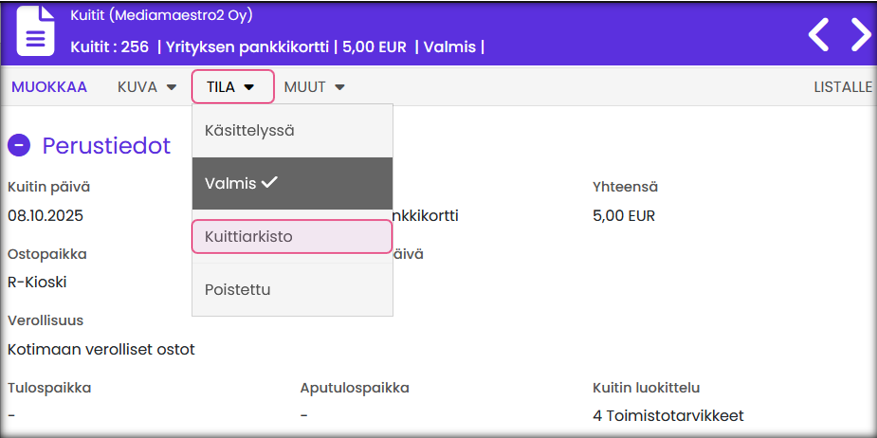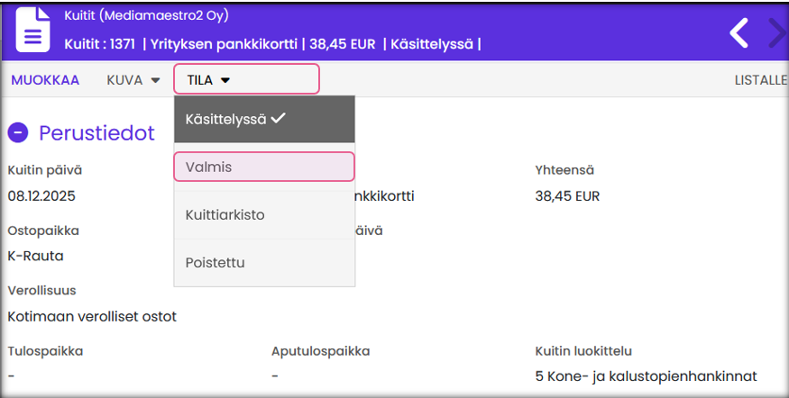 | 3. Siirrä kuitti Valmis-tilaan | → Järjestelmä muodostaa kirjanpidon tositteen. |