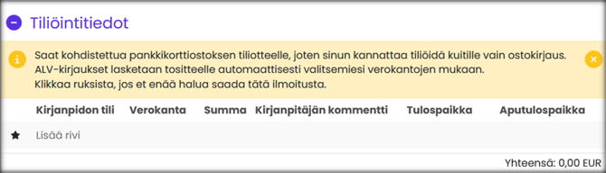 - Siirry kohtaan Tiliöintitiedot ja paina Lisää rivi.