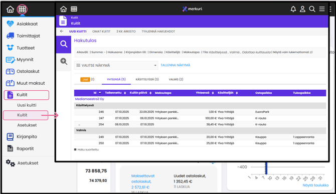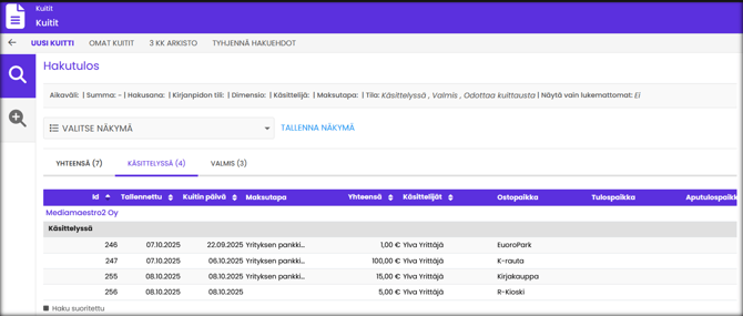 Keskeneräiset kuitit löytyvät Käsittelyssä-tilassa.