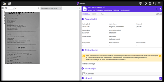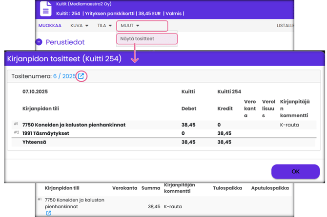 - Kuittiin liittyvä tosite tulee näkyviin.
