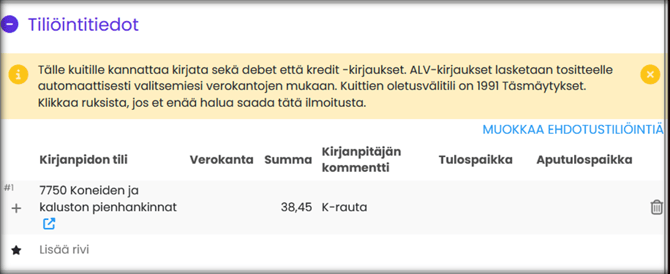Jos haluat muokata vain käsiteltävän kuitin tiliöintiä, tee muutokset suoraan kuitin tiliöintiriveille ilman pohjan muokkausta.