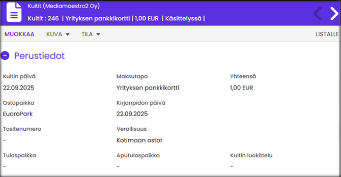 1. Tarkista ja täydennä perustiedot – varmista, että kuitin tiedot ovat oikein ja täydelliset.