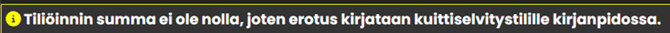 "Tiliöinnin summa ei ole nolla, joten erotus kirjataan kuittiselvitystilille kirjanpidossa."