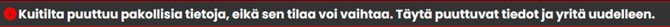 → Tarkista ja täydennä kaikki vaaditut kentät ja yritä uudelleen.![]()
