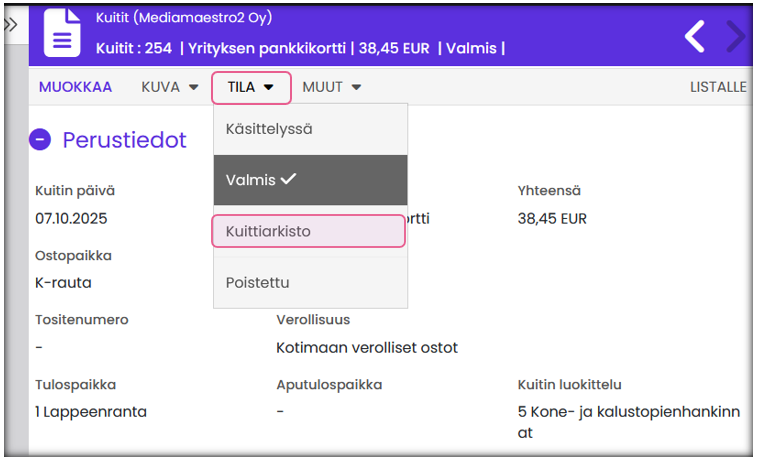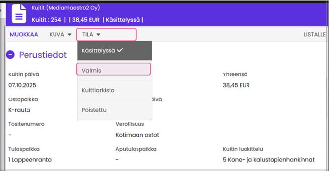 3. Siirrä kuitti Valmis-tilaan – tässä vaiheessa järjestelmä muodostaa kirjanpidon tositteen.