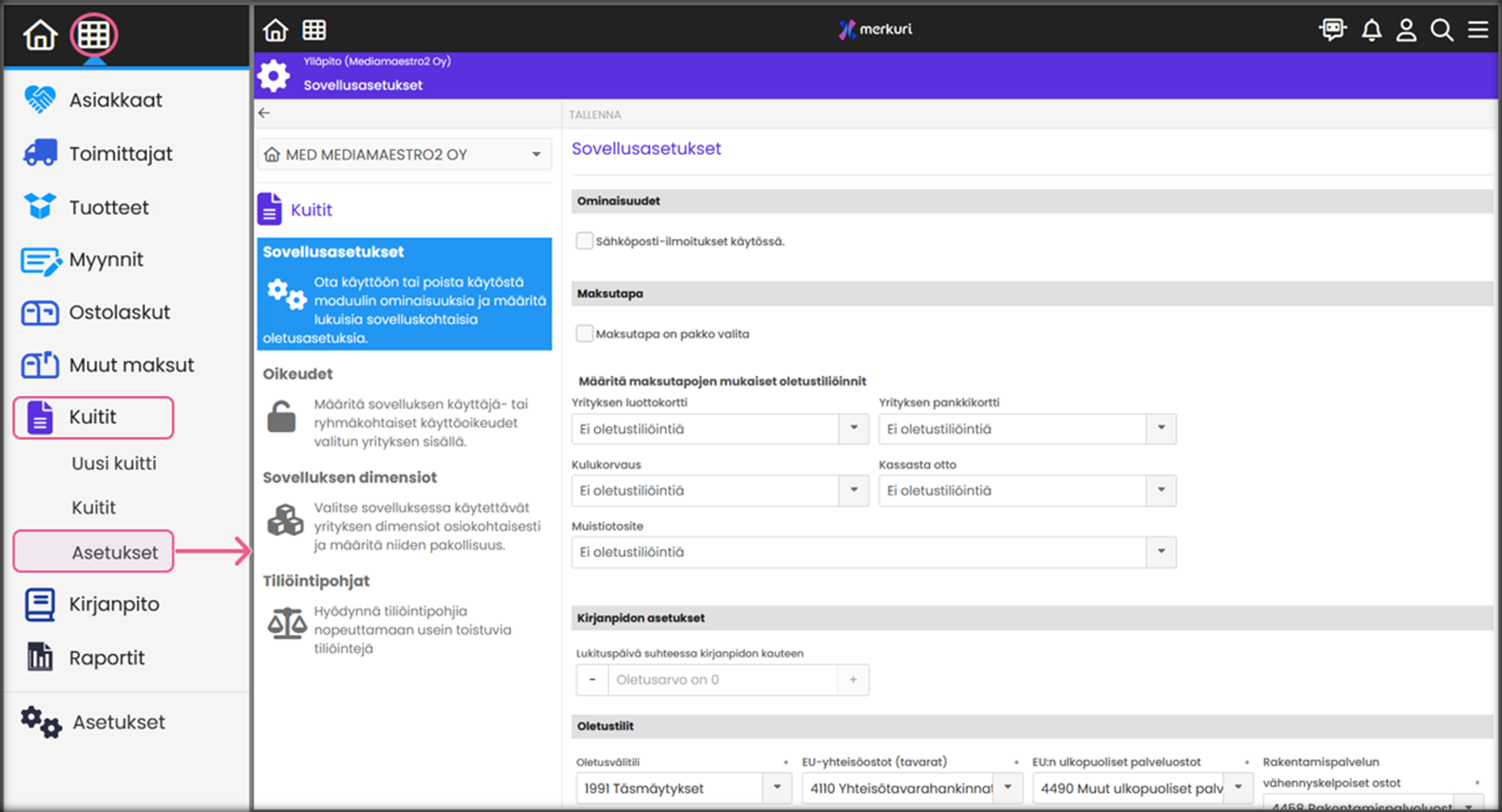 | Sovellusasetukset | Kuittien käsittelyyn liittyviä määrityksiä. |