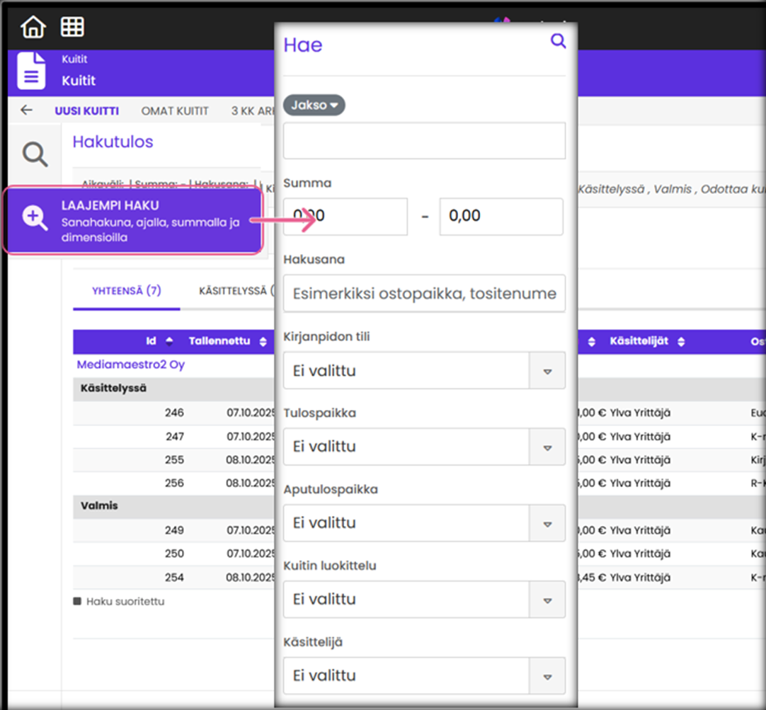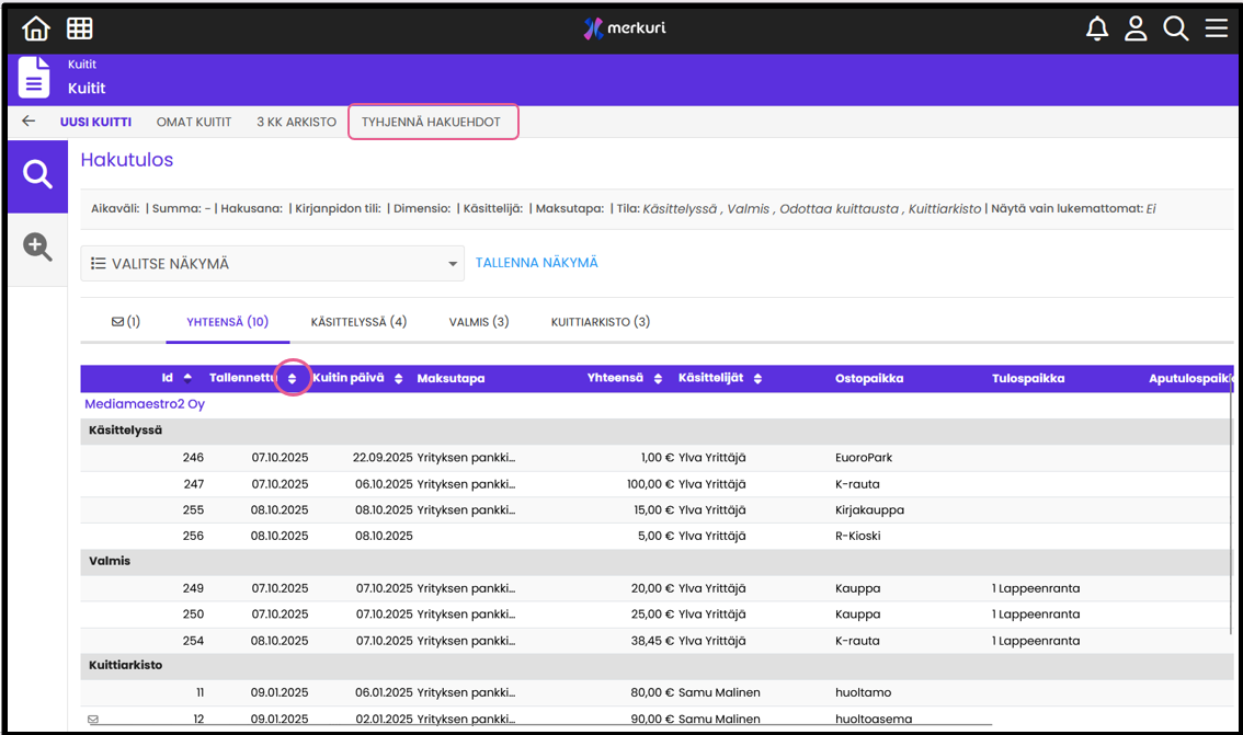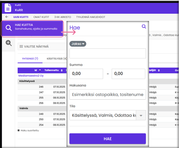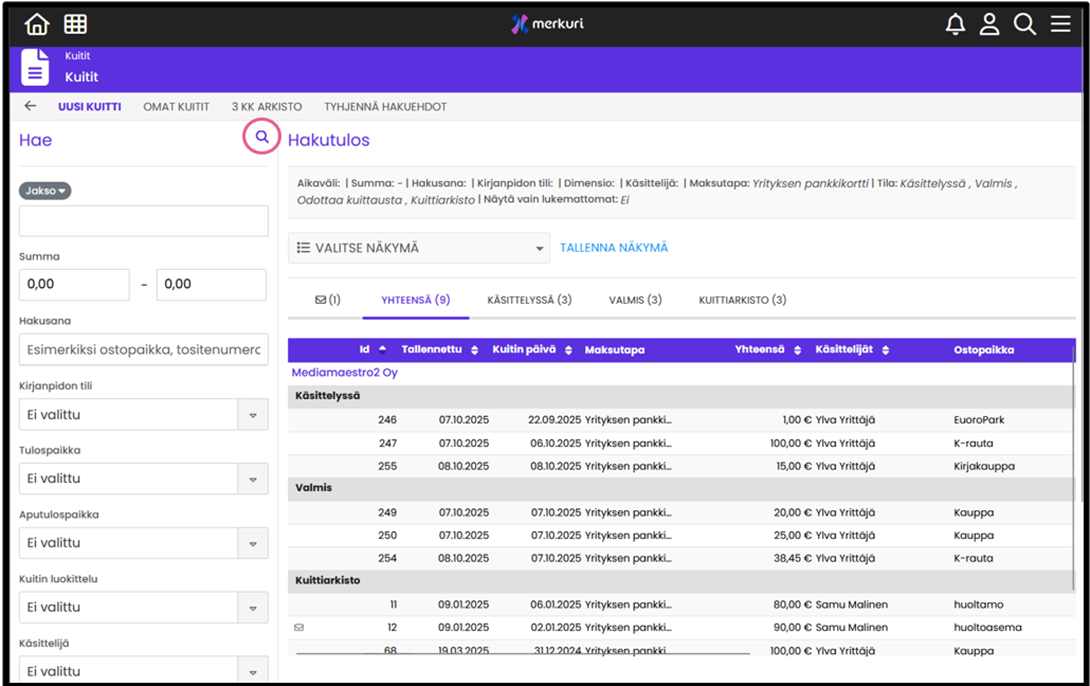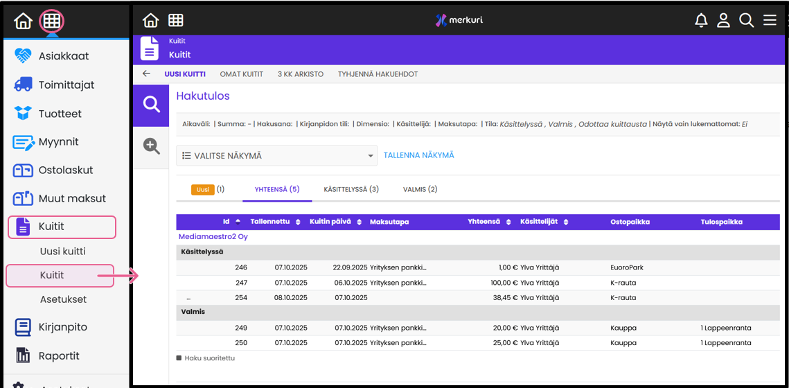 - Tila: Käsittelyssä, Valmis, Kuittiarkisto, Poistettu
