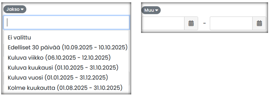 - Jakso-valikko: Valitse valmiita ajanjaksoja (esim. edelliset 30 päivää, kuluva kuukausi).