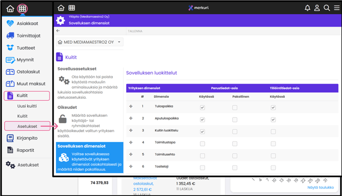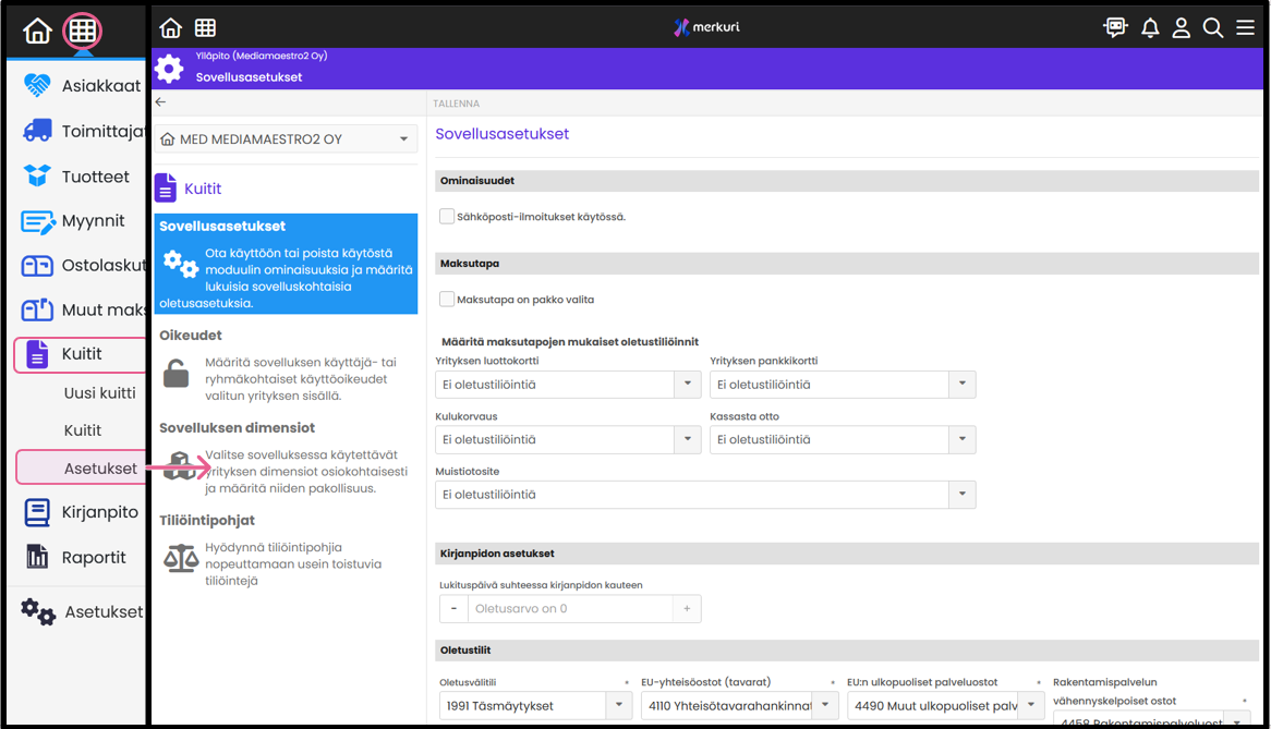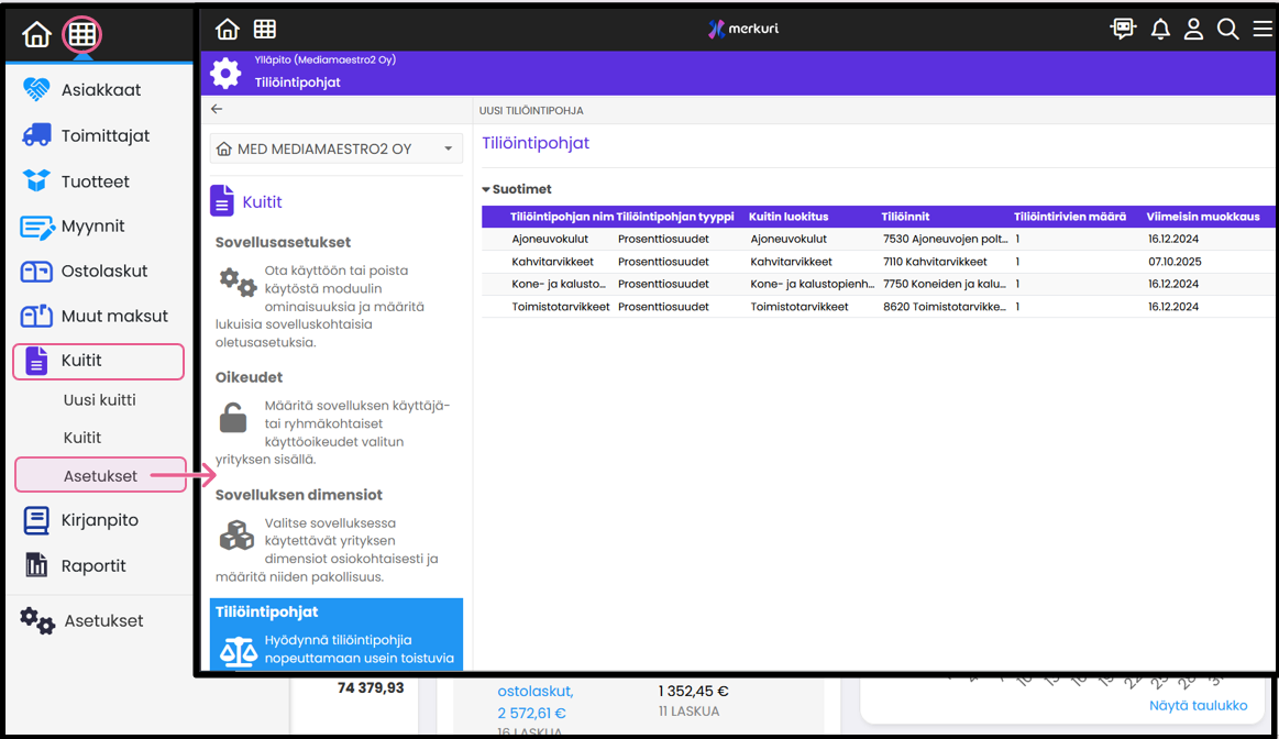 Valitse Kuitit Asetukset Tiliöintipohjat