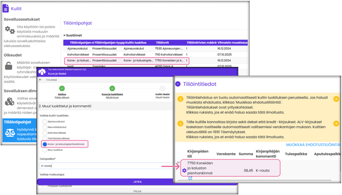Tiliöintipohjien avulla kuiteille tuodaan automaattinen tiliöinti kuitin tuomisen yhteydessä kuitille valitun kuitin luokittelun perusteella.