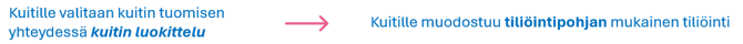 Kun kuitille valitaan Kuitin luokittelu ja kyseiselle luokittelulle on määritelty tiliöintipohja, muodostuu kuitille automaattisesti tiliöintipohjan mukainen tiliöinti.