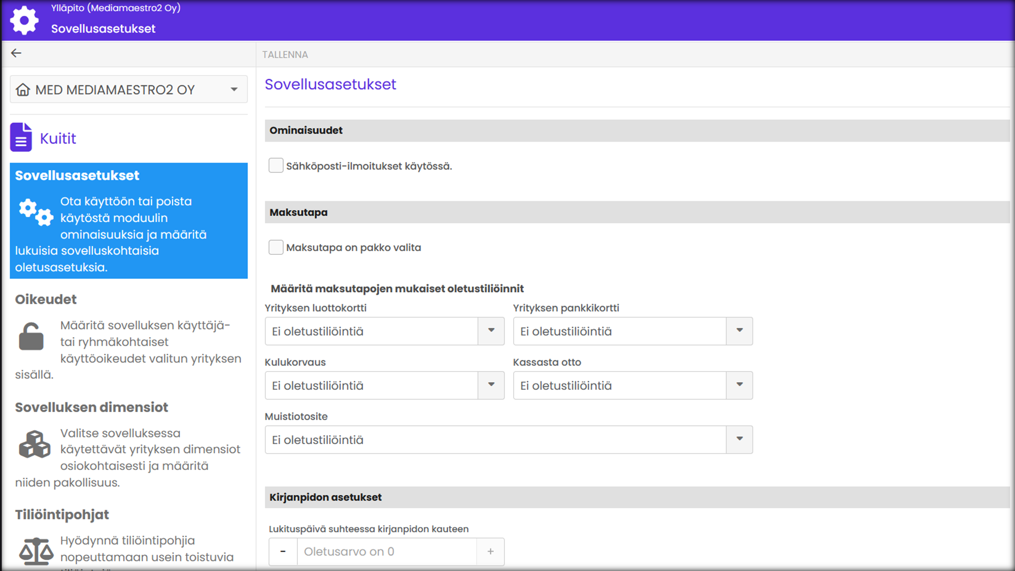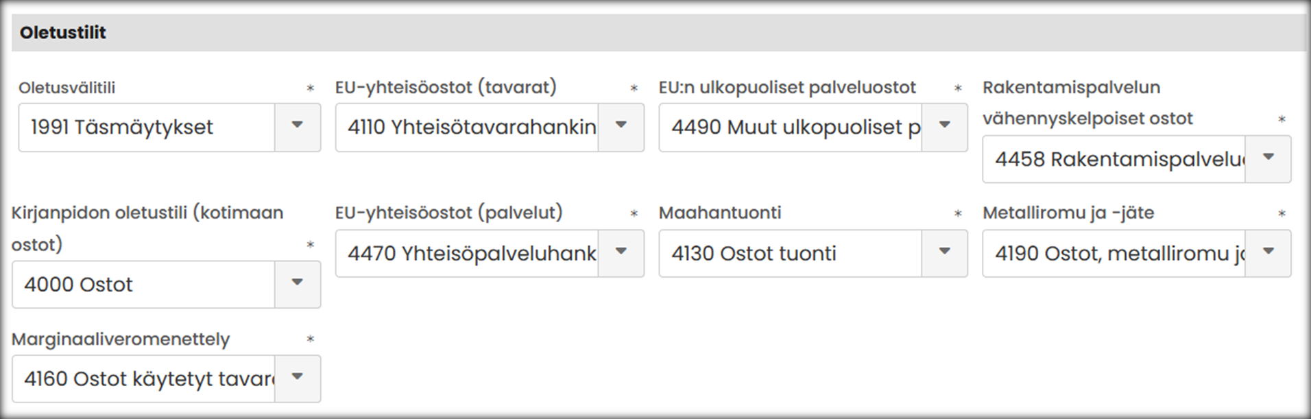 Oletustilit: Kuittien käsittelyyn liittyvät oletustilit. Tietoja voi tarvittaessa muokata.