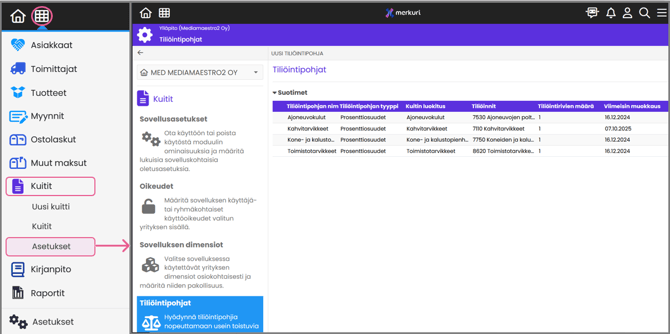 Valitse Kuitit Asetukset Tiliöintipohjat