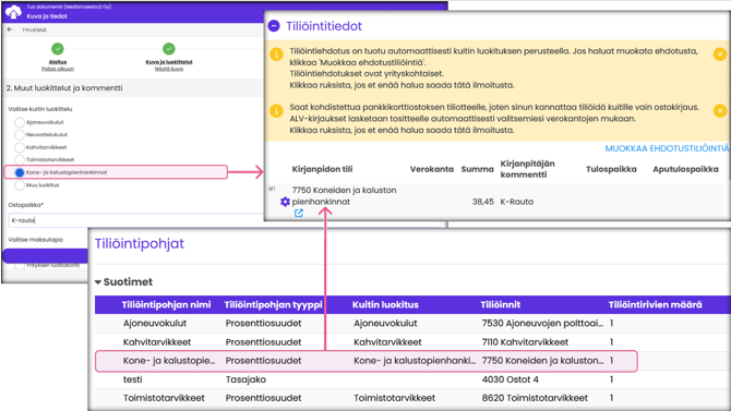 - Tiliöintipohja linkitetään "Kuitin luokitteluun"
