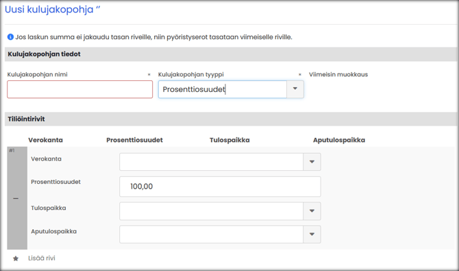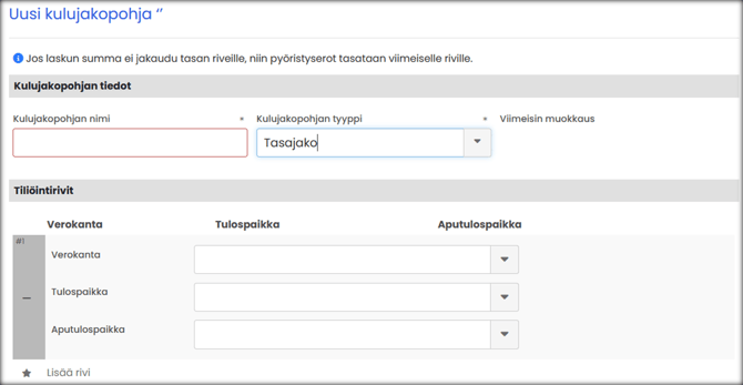 Valitse Ostolaskut → Asetukset → Kulujakopohjat → UUSI KULUJAKOPOHJA