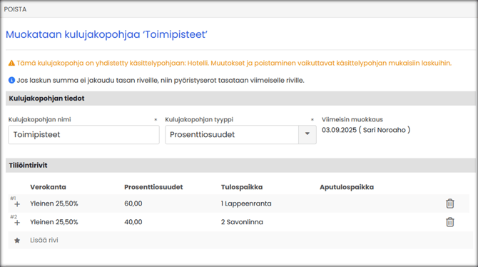 "Tämä kulujakopohja on yhdistetty käsittelypohjaan. Muutokset ja poistaminen vaikuttavat käsittelypohjan mukaisiin laskuihin."