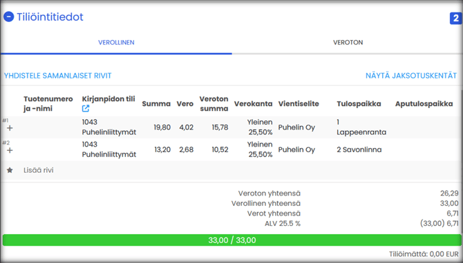 - Siirry laskun Tiliöintiedot-osioon ja tiliöi lasku.