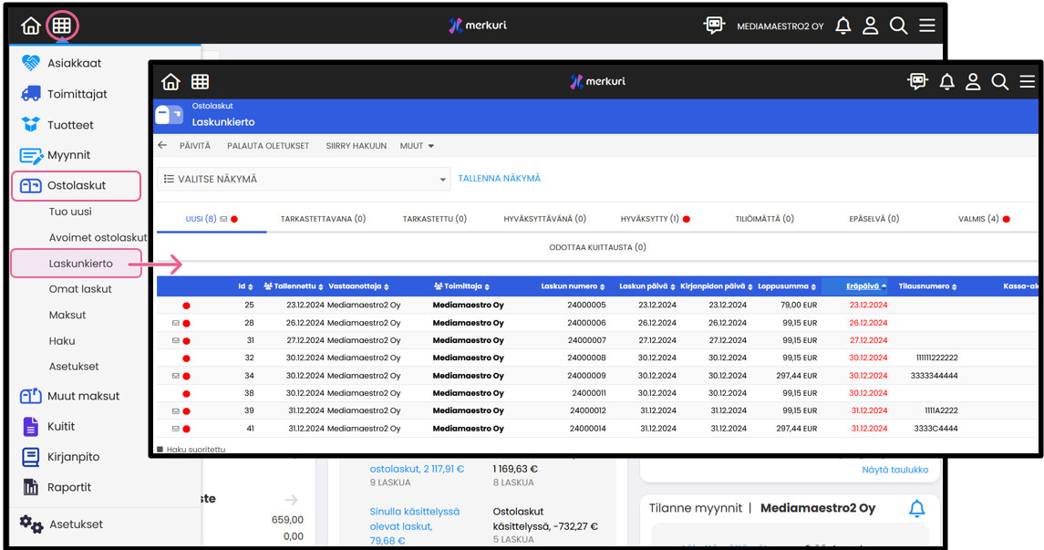 Laskuja voi järjestää nousevaan tai laskevaan järjestykseen nuolipainikkeilla.