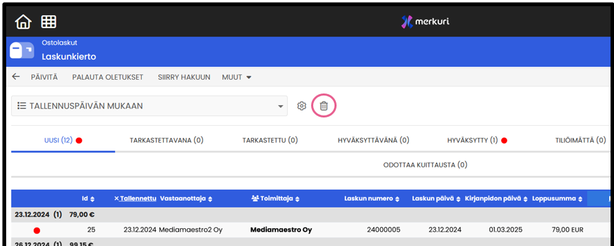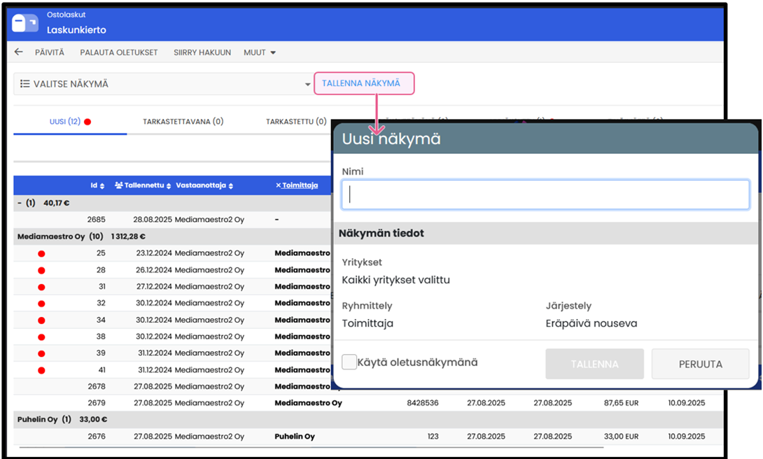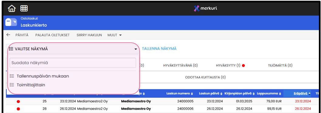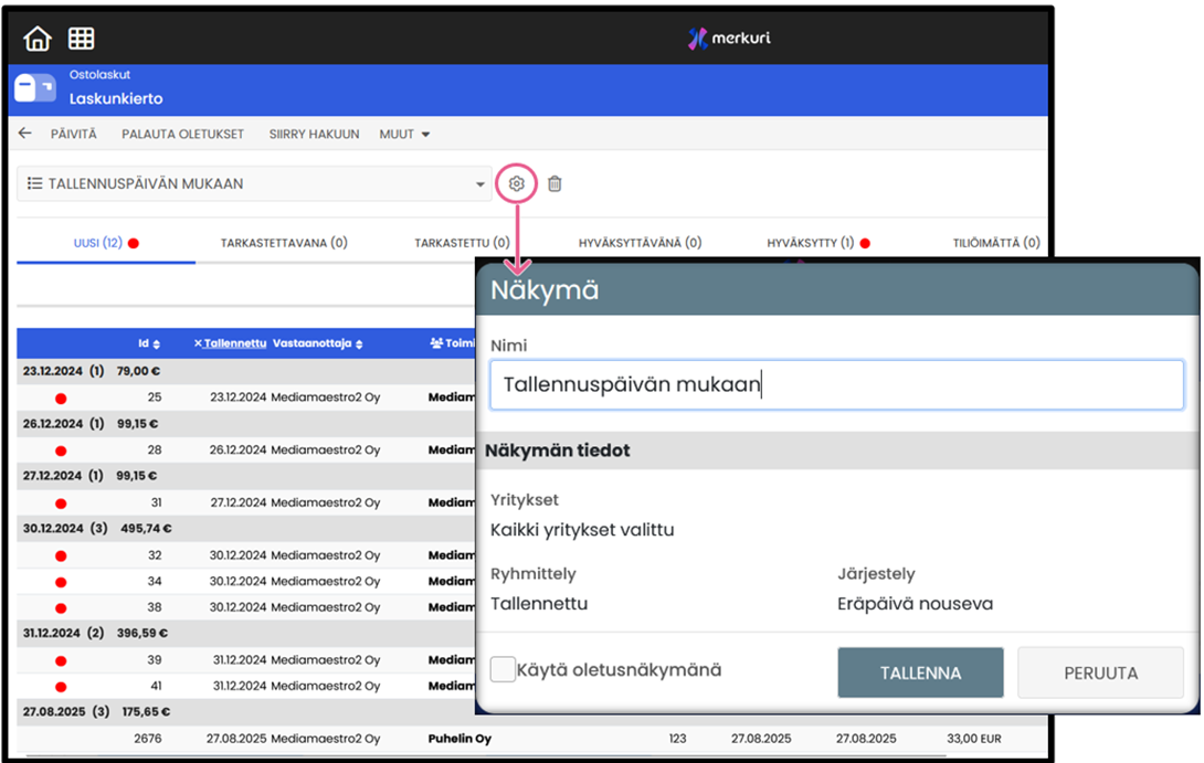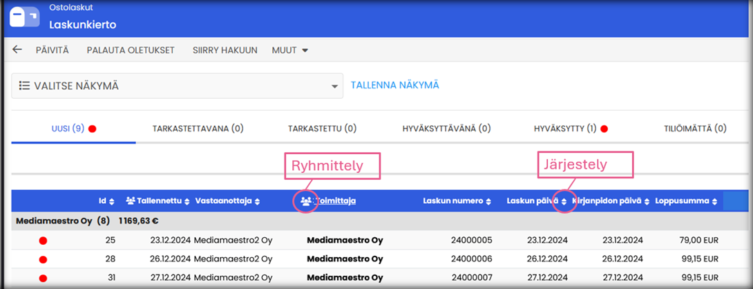 Laskut voi ryhmitellä ryhmittely-kuvakkeen avulla.