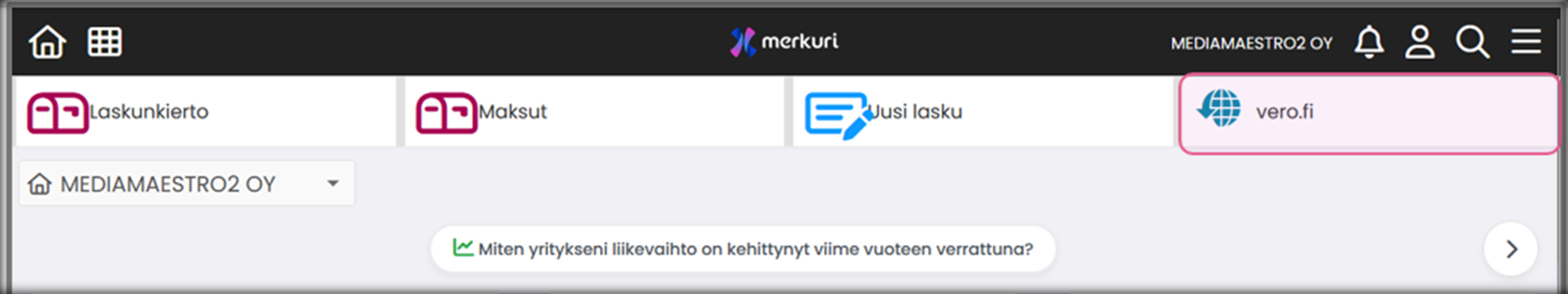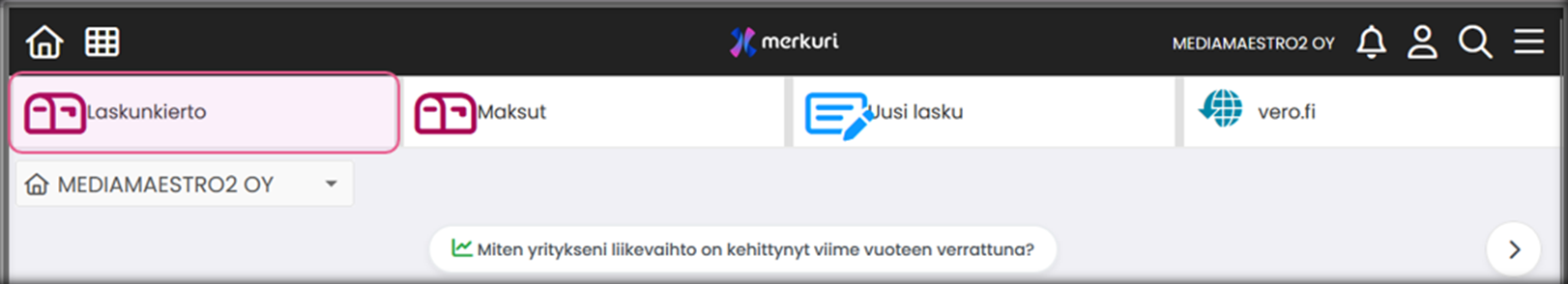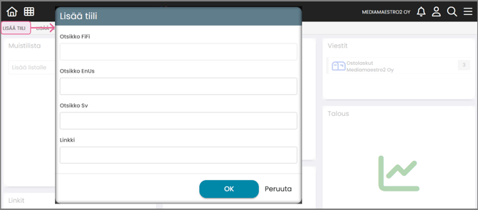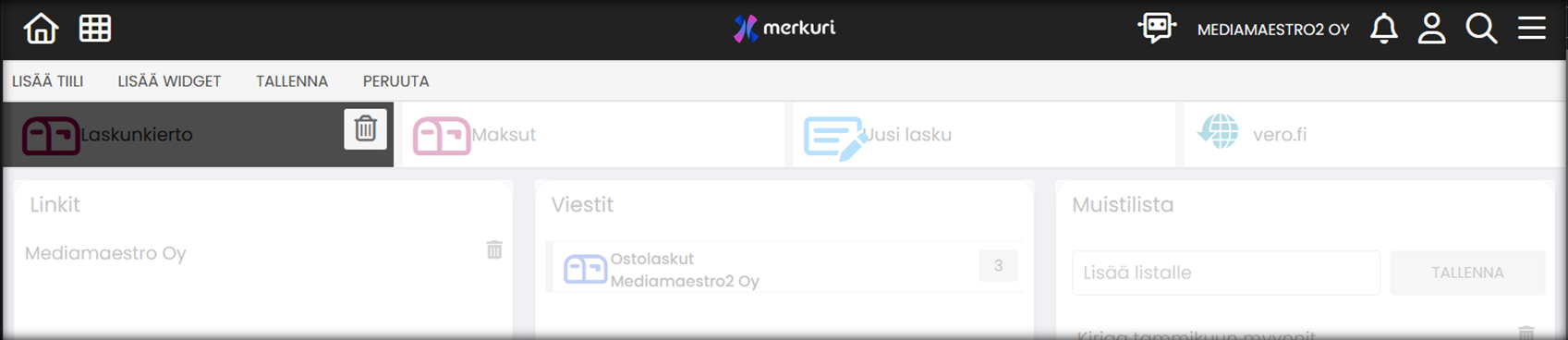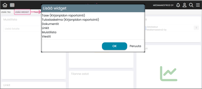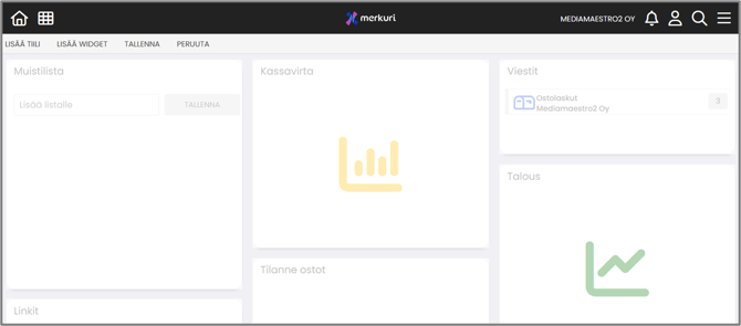 | LISÄÄ WIDGET | Lisää etusivulle uusia toimintolaatikoita (ostolaskujen viestit-laatikko, tuloslaskelma, tase jne.) |