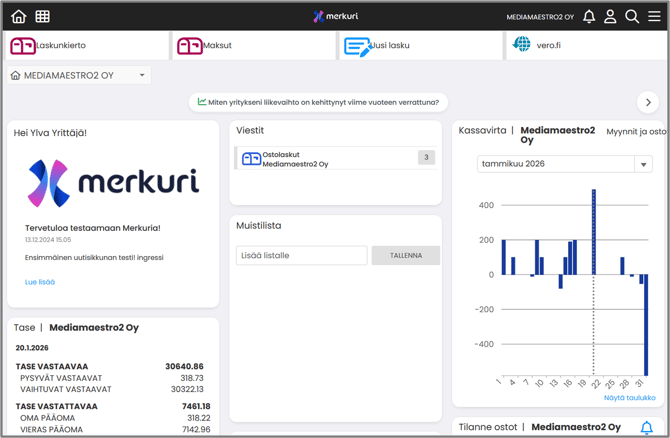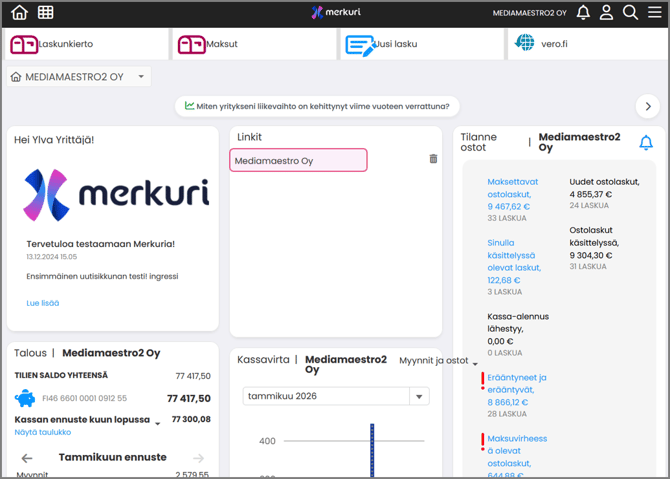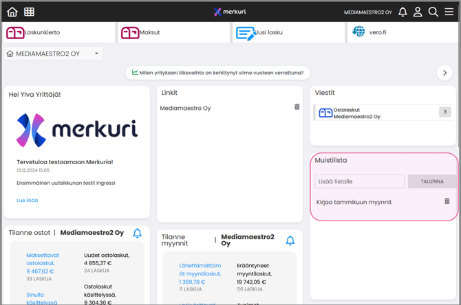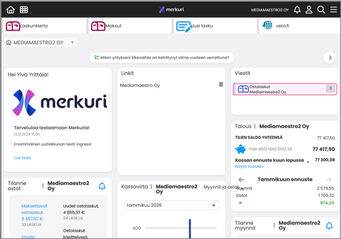 Jos yksikään ostolasku ei odota toimenpiteitäsi, Viestit‑widget ei näy etusivulla.