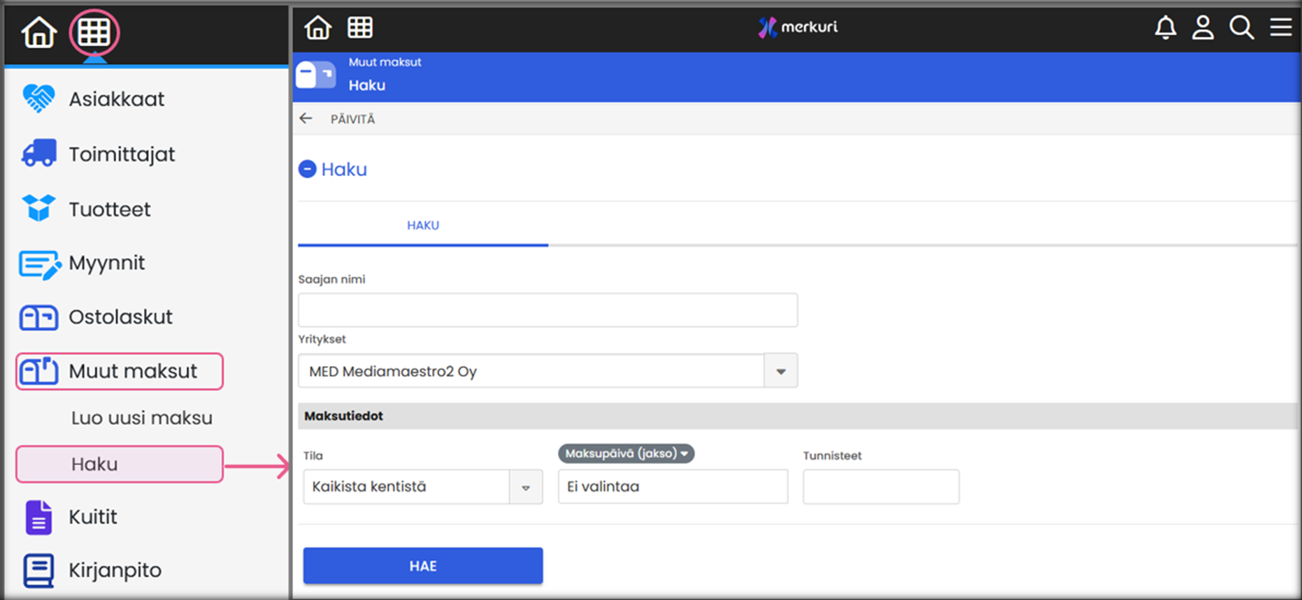 → Hakuehtoja vastaavat maksut listautuvat näkyviin.