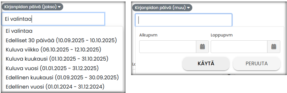 - Jakso-valikko: Valitse valmiita ajanjaksoja (esim. edelliset 30 päivää, kuluva kuukausi)