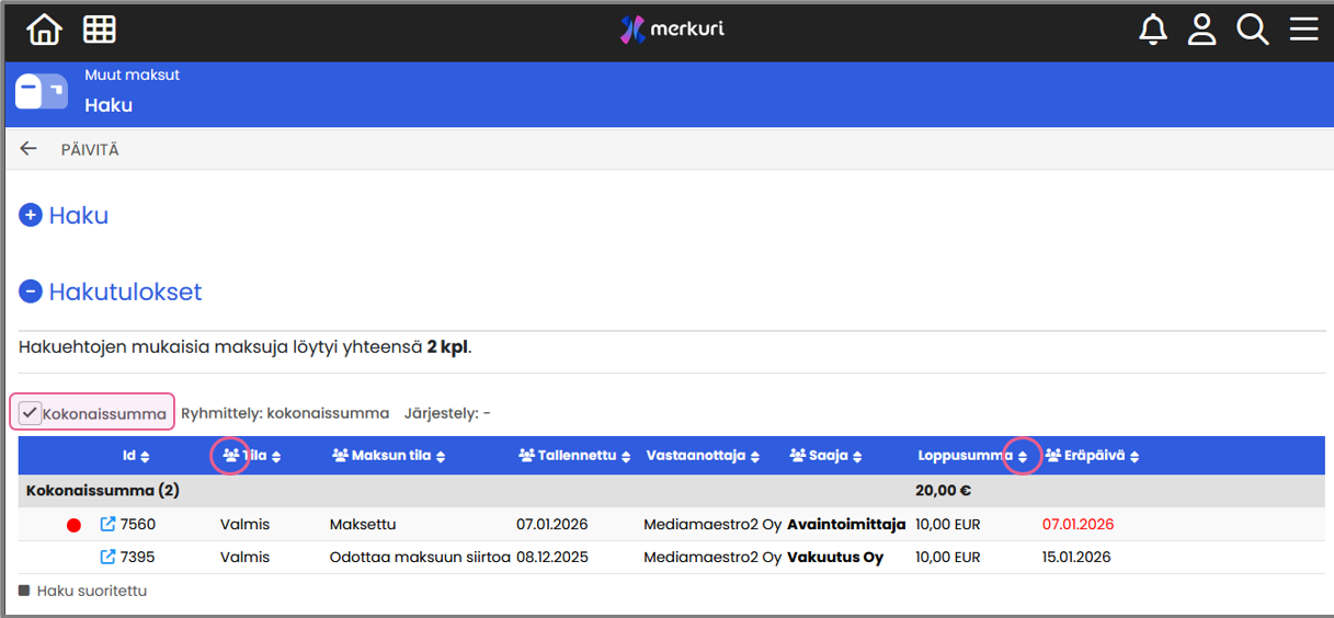 - Kokonaissumma: Näyttää hakutuloksen maksujen yhteissumman