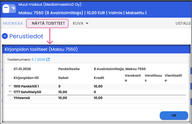 | NÄYTÄ TOSITTEET | Maksuun liittyvä kirjanpidotn tosite. Näkyvissä, jos maksun tila on Maksettu. |