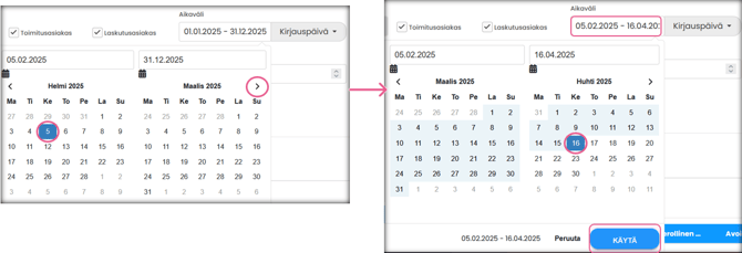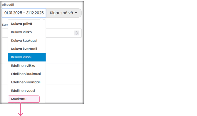| Lisävalinta: Päivämääräkenttä | Määritä, mihin päivämääräkenttään aikarajaus kohdistuu. Vaihtoehdot: Kirjauspäivä, Toimituspäivä, Eräpäivä, Valitse kaikki. |