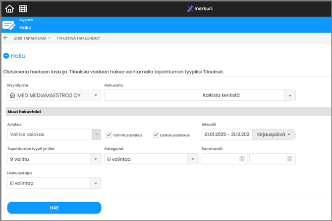 | HAE TAPAHTUMIA | Avaa hakulomakkeen, jossa voit määrittää: - Haetaanko tilauksia vai laskuja - Mitä tapahtuman tiloja haetaan |