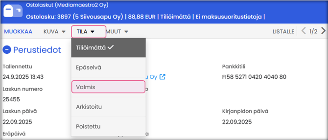 - Voit siirtää laskun Valmis-tilaan manuaalisesti: