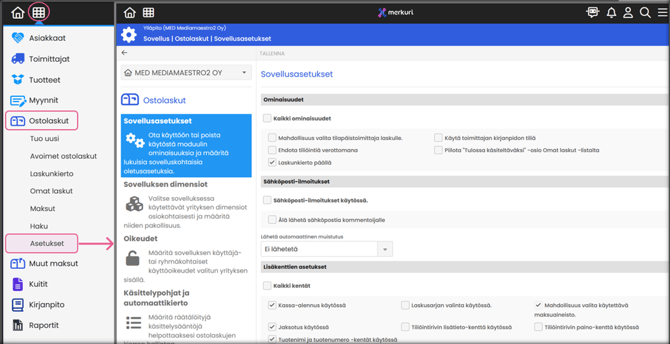 | Sovellusasetukset | Ostolaskujen käsittelyyn liittyviä määrityksiä. |