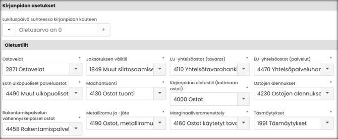 Kirjanpidon oletustilit, joita käytetään automaattisesti ostolaskujen kirjanpidon tositteiden muodostuksessa. Voit muokata oletustilejä tarpeen mukaan.