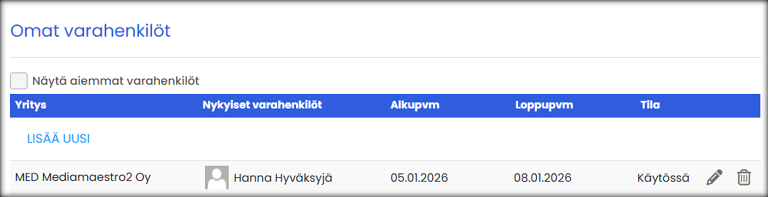 | Nykyiset varahenkilöt | Hae henkilö, joka toimii valitun käyttäjän varahenkilönä |