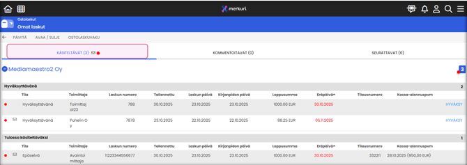 | KÄSITELTÄVÄT | Laskut, jotka odottavat toimenpiteitäsi. |